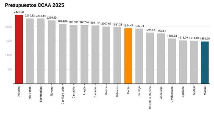 3 .- El mayor presupuesto per cápita, al igual que en 2024, es el de Asturias (2422,28€, lo cual supone un aumento de 114,42€ con respecto al año anterior) mientras que el menor es el de Madrid (148225€, suponiendo un leve aumento con respecto a 2024: 32,16 € más), que lo es por sexto año consecutivo, y ello a pesar de que, como ya se ha señalado, 4 CCAA tienen prorrogados los presupuestos. La ratio máximo-mínimo es de 1,63, la más elevada de los años analizados.