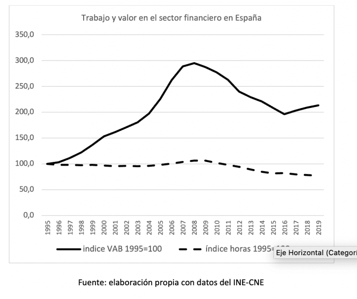 Para finalizar con el argumento de lo que pudo haber sido y no fue en España en relación a la jornada laboral (ya sea en cómputo anual de horas o en horas a la semana) parece oportuno fijarse en el sector financiero en la medida en que es un ejemplo paradigmático de la transición digital que viene acelerándose desde los años 90 del pasado siglo.