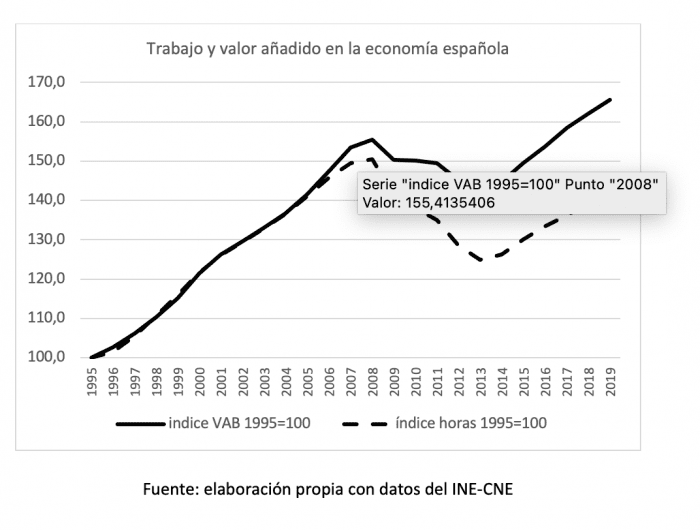 En este caso la brecha de productividad entre las horas necesarias y el valor producido es mucho mayor y permanente. Porque ahora con menos horas que en 1995 (un 33% menos) se genera un valor muy superior al de aquel año (un 47% mayor).