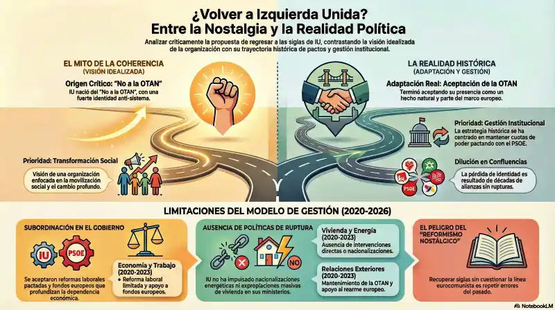 En definitiva, la opción de «Volver a IU» más parece un reformismo nostálgico que una alternativa. Porque propone recuperar una sigla sin cuestionar la línea eurocomunista seguida de adaptación al capitalismo europeo.